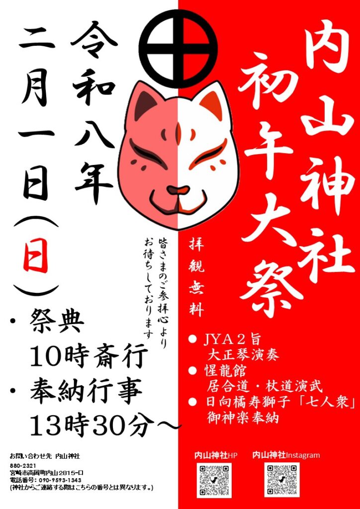 初午は、和銅4年(711年)2月の最初の午の日に、伏見稲荷大社の御祭神(宇迦之御魂神)が稲荷山に降り立ったとされることが起源です。この日を祝う祭礼が初午祭として広まりました。島津家の稲荷信仰は島津忠久(島津家初代当主)誕生伝説が源流とされ、丹後局(たんごのつぼね)が雨の降る夜に狐火に照らされて島津忠久を生んだと言われております。また、朝鮮出兵の際、紅白3匹の狐が明軍に突撃したとも伝えられ、当社では元和元年、大阪の役に出陣の節、稲荷社より白狐赤狐出て先導し、寛永15年の肥前國島原の役にも軍行の先に赤狐が現れたとの伝承もあり、篤く信仰されてきたことが窺えます。その所縁深き祭礼は今年は2月1日(日)10時より祭典行い、13時30分より神楽、居合道、大正琴演奏の奉納行事を予定しております。皆様のご参拝心よりお待ち申し上げております。